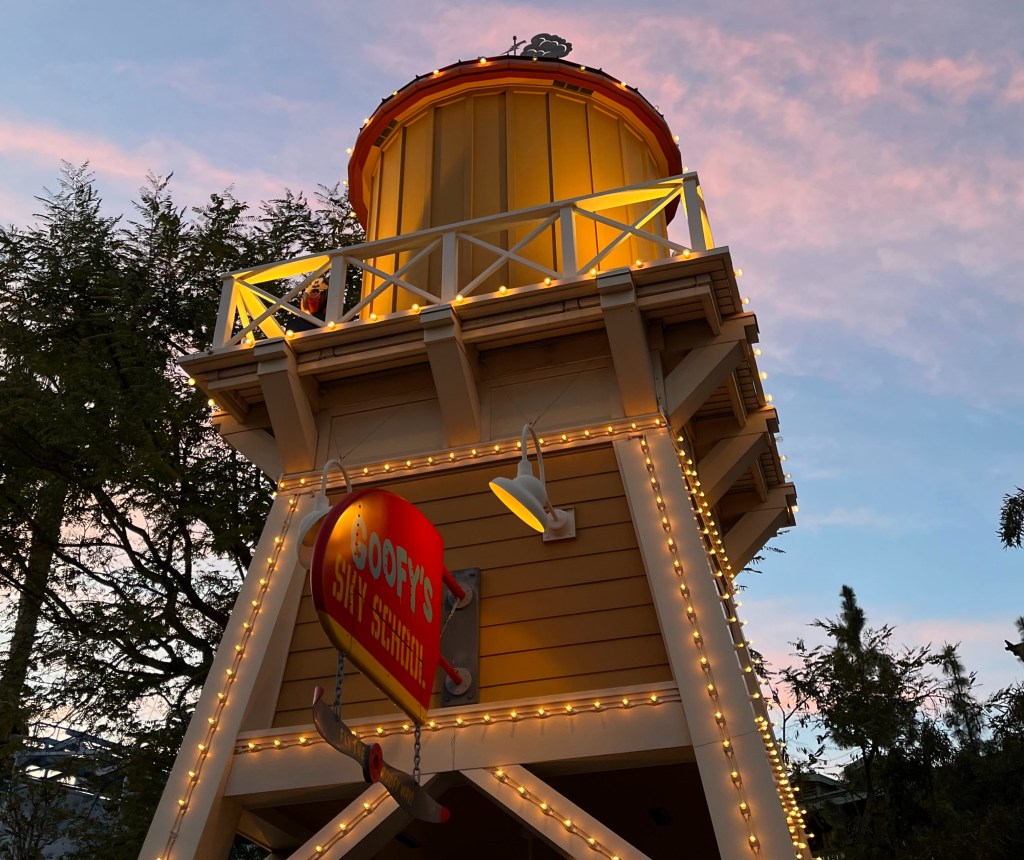 In Paradise Pier, Goofy’s sky school has a water tower but it doesn’t have water. Look! It’s Goofy! He is on his own ride! I wonder if he flew up there and got stranded.