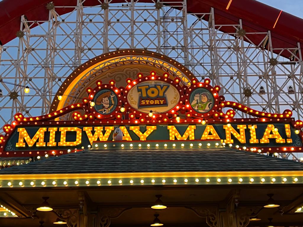 Midway Mania is a fun rootin shootin game ride where you shoot balls or whatever at targets. Near the sign Daisy is on it! It’s covering the A.