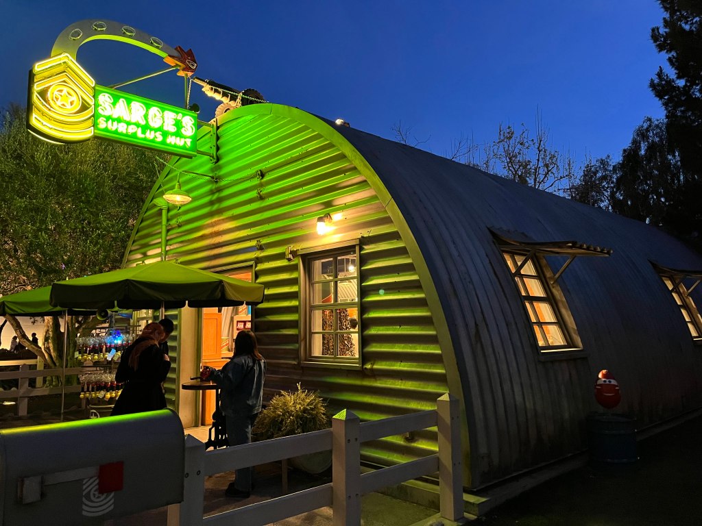 Sarge’s hut is in Cars land. It’s next to the Cozy Cone Motel. You see that fence next to the Cozy Cone Motel? It’s Lightning Mcqueen! A car in Cars Land!