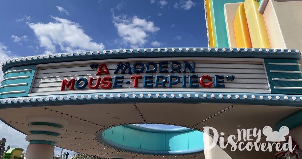 2. Also when you are on the right, look up at the theater you’ll see red and blue letters. The red letters spell out A MUST C, meaning they’re saying that the Perfect Picnic (the preshow for Runaway Railway) is awesome. If you’re wondering what it really says, it says, “A MODERN MOUSE-TERPIECE.