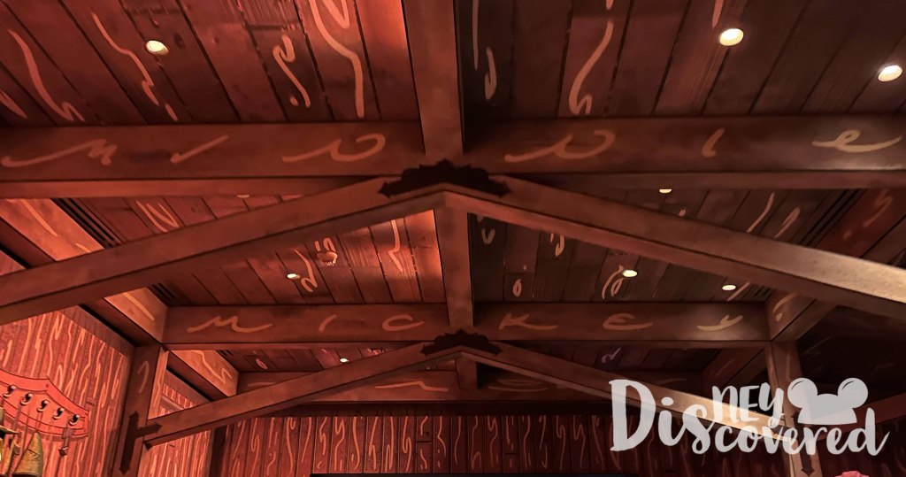 14. Still standing there? Look up high and to the right. It spells out Minnie if you look at the line on the wood up top. Also, it spells Mickey right behind the Minnie one.